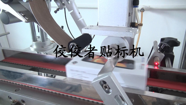 下面我們來介紹全自動上下面轉角貼標機的貼標全過程,首先將包裝盒放到傳送帶上,移動到下圖的黑色小柱體后面時被貼上轉角標簽,如下圖: