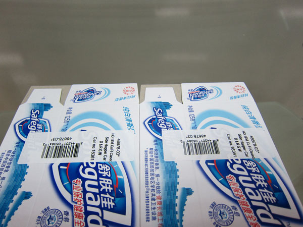 下圖是我公司類卡片實(shí)時(shí)打印貼標(biāo)機(jī)對(duì)舒膚佳包裝盒進(jìn)行平面貼標(biāo)的樣品圖片。